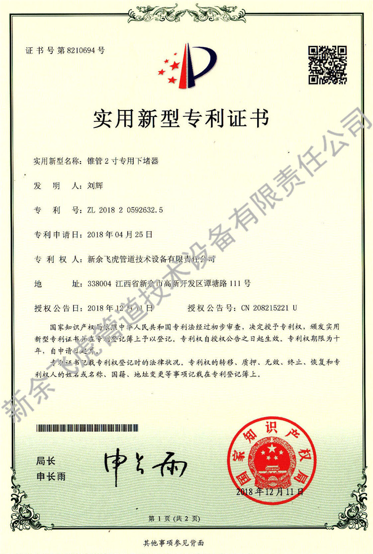 椎管2寸专用下堵器-实用新型专利证书